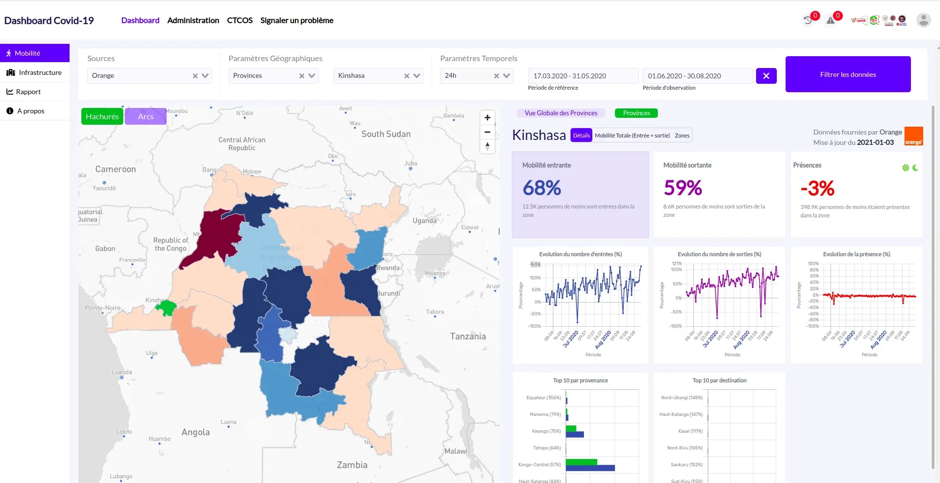Développement d’un dashboard de suivi de l’épidémie, des capacités hospitalières et de la mobilité de la population à l'aide des données de mobilité des abonnées de Orange (Données CDR anonymisées).